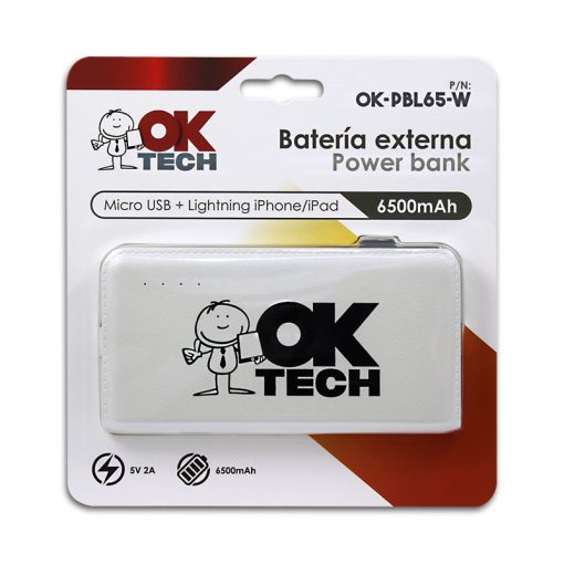 Una cómoda manera de alargar el tiempo de uso de tus dispositivos portátiles. Con la batería externa de OkTech de 6500mAh podrás recargar una gran variedad de productos digitales como smartphones, cámaras, MP3/MP4, tabletas, iPhone, iPad… Ligera, fácil de llevar y con funda de protección con textura símil piel.