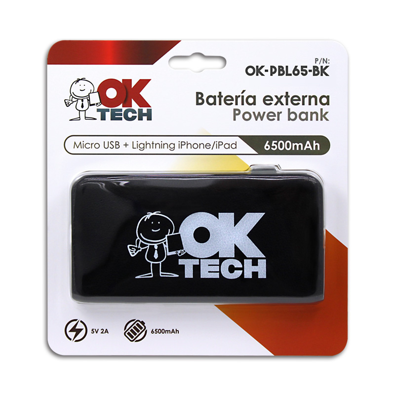 Una cómoda manera de alargar el tiempo de uso de tus dispositivos portátiles. Con la batería externa de OkTech de 6500mAh podrás recargar una gran variedad de productos digitales como smartphones, cámaras, MP3/MP4, tabletas, iPhone, iPad… Ligera, fácil de llevar y con funda de protección con textura símil piel.