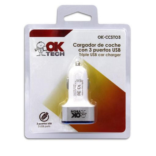 OkTech OK-CCST03 Cargador de Coche 3 Puertos USB 5V 3.1A Blanco/Plata.