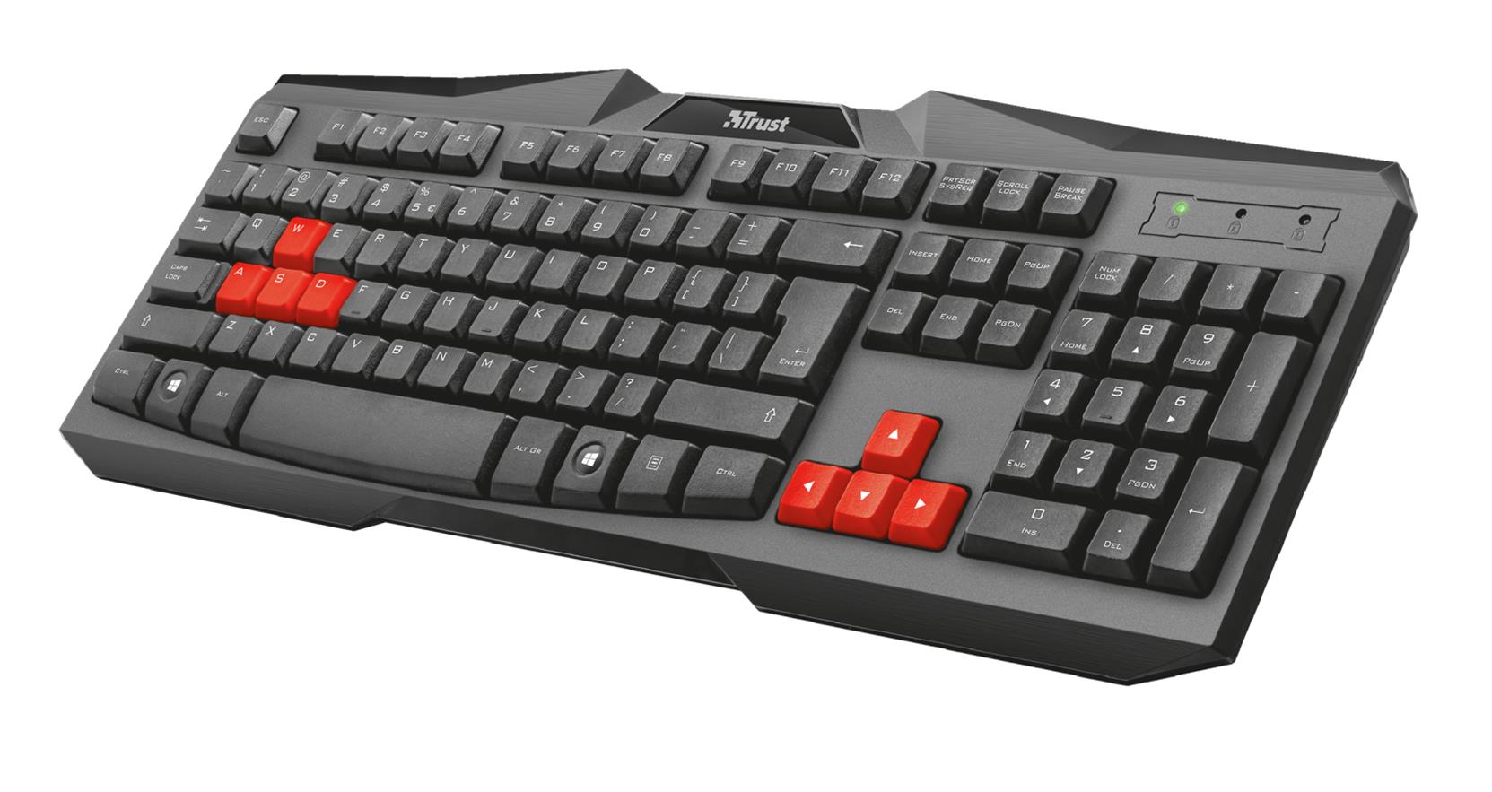 – Teclado de tamaño normal con teclas para juegos de color rojo.