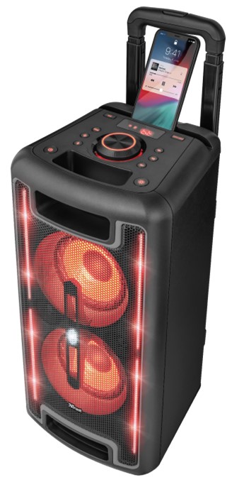La música de tu fiesta mejorará enormemente con el altavoz portátil con Bluetooth e iluminación RGB para fiestas Klubb MX GO 160W de Trust. Capta la atención de tus amigos con el potente sonido de sus 160 vatios de potencia máxima. Además, este generador de sonido tiene un diseño portátil con asideros, ruedas y asa retráctil de carrito para que puedas desplazar el altavoz fácilmente.